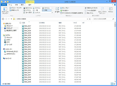 続いて、SDメモリカードからPCへ、画像データを転送する際の速度をテストした。使用したPCは、レノボのウルトラブック「IdeaPad Yoga 13」、カードリーダーは、USB 3.0とUHS-Iに対応するトランセンド「RDF8」だ。