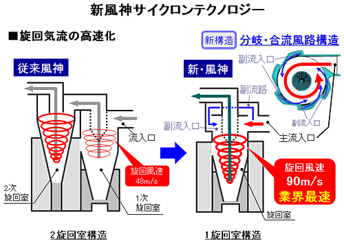 新型の「風神 TC-ZXC30P」は、旋回室が一つしかない。しかし、新構造の分岐・合流風路構造「ハイパーエアロアクセル」で吸い込んだ空気を主流と副流に分け、サイクロンボックスで合流させることで高速の渦巻きを発生させる。旋回室の風速は業界最速の90m/秒で、この高速の渦巻きがしっかり空気とゴミを分離する。ゴミを分離する威力を上げながらも、旋回室を小さくすることでコンパクト化を実現したのだ。