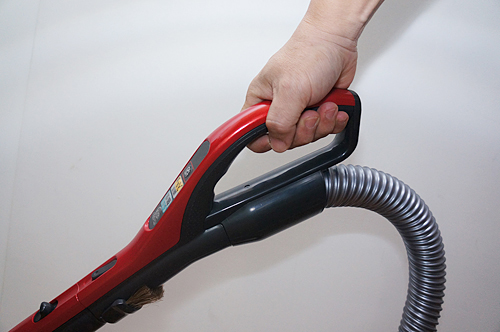 持ち運びやすさもポイントだ。ボディにカーボン素材を採用し、重さを約3.8kgに抑えているので、1階から2階へラクに持ち運ぶことができた。ボディにはサッと持てる2WAYハンドルを装備し、片手で本体を持ち上げながら、反対の手でハンドルを持ってヘッドを取り回すのも簡単。これなら階段の掃除もしやすい。