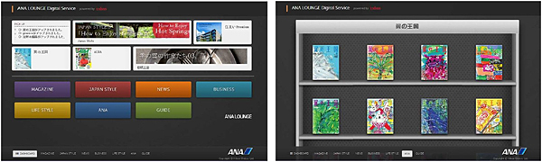 提供コンテンツは、「MAGAZINE」「JAPAN STYLE」「NEWS」「Business」「ANA」「Life Style」の6種類を用意する。「MAGAZINE」では書籍や雑誌、マンガ、「JAPAN STYLE」では日本の文化・伝統工芸・食などの情報、「NEWS」では全国紙や地方紙、通信社からの最新ニュース、「Business」では銘柄レポートやイベント/セミナー情報、「ANA」ではANA発行誌やANA客室乗務員による口コミ情報、「Life Style」では展覧会や住まいに関する情報などを提供する。