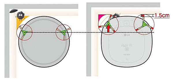 「HOM-BOT スクエア」は、円形のロボット掃除機が苦手とする部屋のコーナーをしっかり掃除できるよう工夫した四角い形状。2012年8月にLGエレクトロニクスが、韓国と欧米で世界で初めて商品化したものだ。形状を変えるととともに、回転ブラシの位置や長さを改良することで、円形の掃除機に比べて、コーナーの掃除効率が89%向上している。