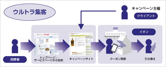 イオンは、ソフトバンクテレコムとヤフーが共同で提供するO2Oサービス「ウルトラ集客」を導入。ポータルサイト「Yahoo! JAPAN」のトップページに掲載するバナー広告を入口として顧客に各種キャンペーンへの参加を促し、イオンやイオンモールの専門店などでの特典を提供する。