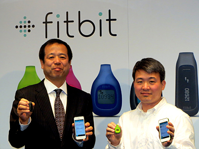 発表会では、米フィットビットのジェームズ・パークCEOが、ソフトバンクBBの溝口泰雄常務執行役員とともに日本初上陸の「fitbit」を紹介した。