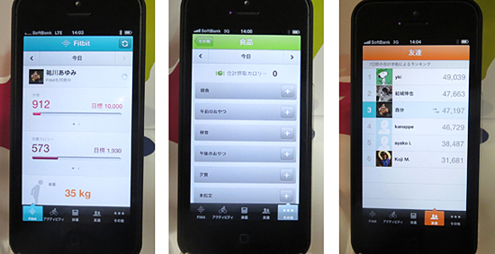 目標に対する活動量(左)や食事の記録ログ(中央)。「fitbit」コミュニティに登録した友だちのなかのランキング(右)を表示する