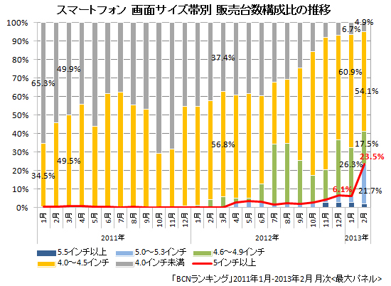 2月に掲載した<2013年1月の携帯電話ランキング、トップの「iPhone 5」に迫る”大画面”の足音>同様、スマートフォンに限って画面サイズ帯別販売台数構成比を集計すると、1月は6.1%に過ぎなかった「5インチ以上」の構成比は、「Xperia Z SO-02E」が売れた影響で2月は23.5%に急上昇した。多くのメーカーが手がけるAndroid搭載スマートフォンでは、今年は「大画面」と「フルHD」がトレンドになりそうだ。