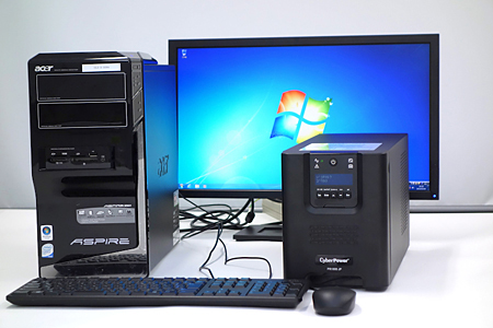 実際に「Smart App PR1500 JP」の大容量バッテリの威力を確かめた。「Smart App PR1500 JP」にデスクトップPCと23インチの液晶ディスプレイを接続して、電源断からどれくらい電源供給が続くか測定した。接続したデスクトップPCは、ちょっと古いがインテル Core 2 Duo E8500を搭載したエイサーの「ASM5621-A21」、液晶ディスプレイは23型ワイドのデルの「E2311H」だ。