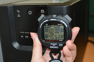 まずは推奨設定通り、8時間かけて「Smart App PR1500 JP」をフル充電。次に、デスクトップPCと液晶ディスプレイのAC電源コードを「Smart App PR1500 JP」のバックアップ用コンセントに接続した。液晶ディスプレイの輝度、コントラストともMAXに設定し、PCはスクリーンセーバーをオフにし、デスクトップ画面を表示するアイドリング状態に設定した。この状態から、停電と同じ状態をつくるために「Smart App PR1500 JP」のACケーブルをコンセントから抜き、バックアップ時間がどれくらい続くかをストップウオッチで計測した。