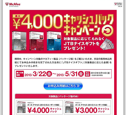 対象製品とキャッシュバック金額は、「マカフィー オール アクセス 2013(5ユーザー1年版)」が4000円、「マカフィー オール アクセス 2013(1ユーザー1年版)」が3000円、「マカフィー トータル プロテクション 2013(3台1年版)」と「マカフィー インターネットセキュリティ 2013(3台2年版)」が2000円、「マカフィー インターネット セキュリティ 2013(3台1年版)」が1000円。