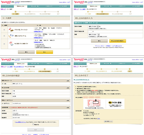 ユーザーが不要になったブランド衣料品や本、デジタルカメラなどの買取りをウェブサイトから申し込んで宅配便で送ると、査定後の買取り金額の通知、指定口座への振込みまでが一貫して提供されるサービス。送料はヤフーが負担する。ヤフーとの直接取り引きになるので、「Yahooウォレット」の本人確認の手続きが完了していれば、申込みのたびに個人情報を入力する必要がなく、簡単に利用できる。