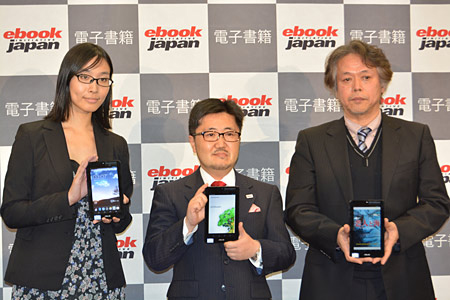 (左からASUSのプロダクトマネージメント課アカウントマネージャーのソフィ・リーさん、イーブックイニシアティブジャパンの小出斉社長、漫画家の六田登さん)