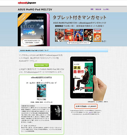 「eBookJapan」では、4月18日までの期間限定で、通常より割安な「ASUS MeMO Pad ME172V」本体と、手塚治虫全集などのコミック作品とのセット販売を行う。