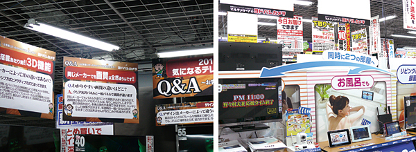 ヨドバシカメラマルチメディア梅田では、「各フロアのレイアウトはフロア責任者などの現場に任せている」(濱田副店長)という。「家電」「パソコン本体」「携帯電話」など、大まかなカテゴリは決めているが、そのなかでレイアウトについては、「お客様の声を聞いている現場が担当したほうがいい」との判断だ。なかでも、お客様の興味を引くために天井から吊しているPOPは非常に凝っている。各製品の機能をわかりやすく解説していることに加えて、最適な用途など記して、お客様に合った商品選びができるよう配慮している。もちろん、そのPOPで商品を選んだお客様には、デモで商品を実際に体験してもらうという演出も欠かさない。