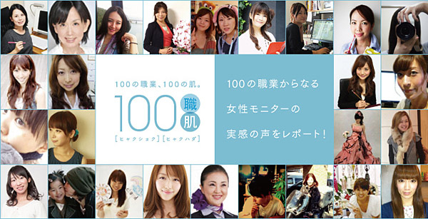 「100職100肌モニターキャンペーン」は、料理研究家、書道家、デザイナー、介護士、CAなど、100の職場別の女性がモニターとして参加。使用7日後、28日後、60日後の3回の使用実感レポートから、肌にどのような変化があったのかを数値化した。