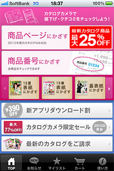 「カタログカメラ」は、AR(拡張現実)技術を活用したアプリ。カタログとスマートフォンを融合し、従来の携帯電話ではできなかった新しいショッピングスタイルを実現する。カタログだけではできなかった値下げ通知のサービスなどの情報も提供する。2013年春号では、すべてのカタログの全ページがARに対応した。