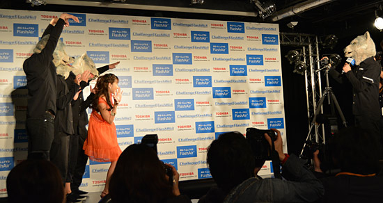 「FlashAir」の使い方をアピールするために、MAN WITH A MISSIONのボーカル・ギター担当のJean-Ken Johnnyが、メンバーと杉原さんを「FlashAir」をセットしたデジタルカメラで撮影。すぐさまスマートフォンからデジタルカメラ内の「FlashAir」にアクセスして、撮ったばかりの写真をスマートフォンにダウンロードしてみせた。杉原さんは「女子会で撮った写真も、すぐにブログに載せられますね。一日6回ブログを更新するのですが、ラクになりそう」とうれしそうに話した。