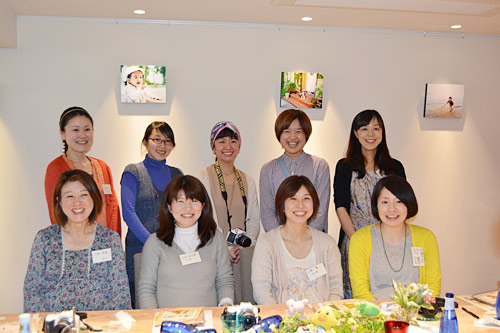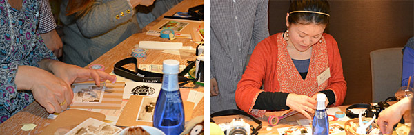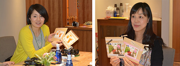 参加した7人のママたちは、指導を受けながら、カメラの設定をしたり、小物を撮影したり。撮影後は、フォトアルバムやスクラップブッキングアイテムなどを販売する写真専門店「ポパイカメラ」自由が丘店の猪野又千恵店長から、写真のコラージュ(飾りつけ)の方法についてレクチャーがあった。ママたちは撮ったばかりの写真を台紙に貼り、かわいい柄つきのマスキングテープで飾り立てていた。