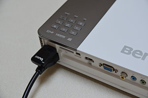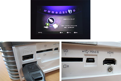 PCにつなぐ場合、ディスプレイケーブルを使うのが一般的だ。「GP10」は、HDMI端子を備えているので、対応するPCであれば、映像と音声をHDMIケーブル1本で転送することができる。また、汎用性の高いUSBケーブルでつないで投写できる「USBディスプレイ機能」が非常に便利だ。本体には、通常のUSB端子に加えて、mini-BタイプのUSB端子も備えているので、デジタルカメラなどの接続に使うUSBケーブルが流用できる。