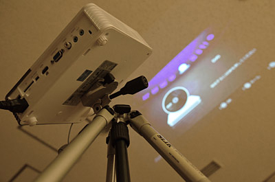 三脚に取りつけて映像を天井に投写することができる。例えば、寝室で映画をあお向けで鑑賞できる