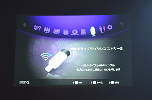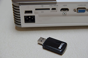 USBでの接続は確かに便利なのだが、「つなぐ」ということに関して、「GP10」が他のプロジェクターと比べて最も便利なのは、PCやiPhoneなどとの間でワイヤレス接続ができることだ。無線LANディスプレイアダプタ(ドングル)が付属していて、これをUSB端子に装着することで、「GP10」はワイヤレス接続ができるモバイルプロジェクターに早変わりする。