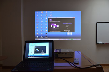 PC内の動画ファイルを投写。また、映像だけでなく音声もプロジェクタ内蔵の3W×2のステレオスピーカーで再生することができる