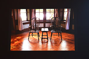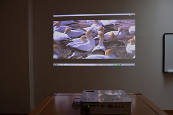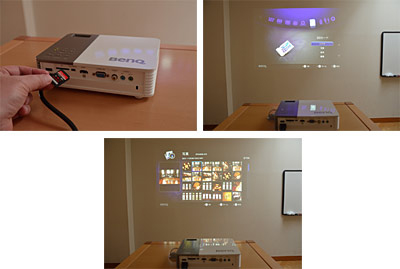 SDカードの写真を投映。550ルーメンの高輝度LEDを搭載、10000:1の高コントラスト比で、照明がいらないくらい外光が入る部屋でも、映像がよく見える
