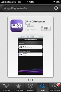 iPhoneやiPadなどのiOS機器を「GP10」にワイヤレスで接続するためには、まずApp Storeから専用アプリ「GP10 QPresenter」をインストールする。こちらも一度設定してしまえば、次回からの接続は手間がかからない。また、GALAXY Tab 10.1でも、Androidアプリ「QPresenter」をインストールすることで、ワイヤレスでつなげることができる。
