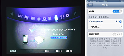 iPhoneやiPadとワイヤレス接続するには、まず「GP10」のホーム画面の「USBドライブ/ワイヤレスディスプレイ」で、「モバイルディスプレイ」を選択。続いてiPhoneやiPadの「設定」で「Wi-Fi」の接続先を「BenQ GP10」にしておく