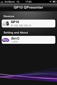 「GP10 QPresenter」を起動すると接続先を自動的に認識。「GP10」を選択すれば完了だ
