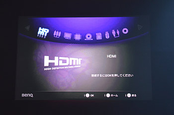 AV機器などをHDMIケーブルで「GP10」に接続して投写を行うには、ホーム画面で「HDMI」を選択する