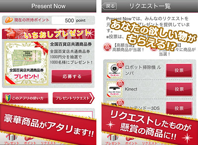 「Present Now」をダウンロードしてユーザー登録すると、アプリ上でアンケートに回答したり、指定の別アプリをダウンロードして毎日起動したり、会員登録したりするともらえる「ポイント」を貯め、そのポイントを使って、先着プレゼントや抽選で豪華賞品が当たるプレゼントに応募することができる。