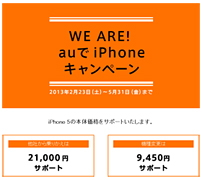 KDDIも、MNP(他社からの乗り換え)または機種変更に限ってiPhone 5の端末価格を割り引く「WE ARE! auでiPhoneキャンペーン」を5月31日まで延長している。割引額は、MNPの場合が2万1000円、機種変更の場合が9450円で、機種変更は現在の端末を13か月以上利用していることが条件となる。