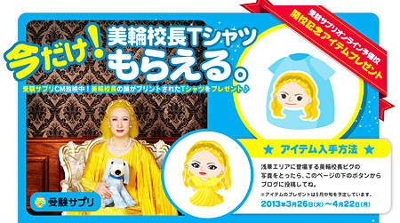 受験生の合格祈願のために、「受験サプリ」のCMに校長として登場する美輪明宏さんが「アメーバピグ」内に期間限定で登場。美輪校長の顔をプリントしたTシャツをプレゼントする「受験サプリオンライン予備校開講記念アイテムプレゼント」キャンペーンを実施している。
