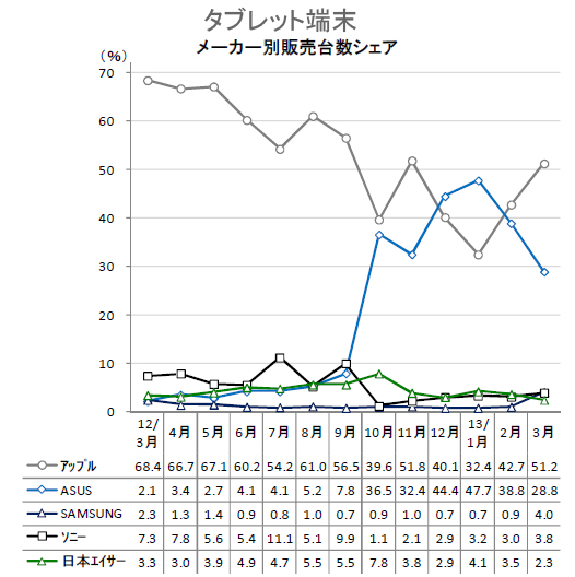 タブレット端末は、2010年5月のiPad発売からしばらくの間、緩やかな伸びにとどまっていたが、Nexus 7やiPad miniなどの7インチモデルが登場したことで、2012年10月頃から急成長。今年3月には、販売台数が2010年5月の6倍に拡大し、パソコン全体(ノートPC+デスクトップPC+タブレット端末)での販売台数構成比が3割に達した。メーカー別の販売台数シェアをみると、アップルとASUSが2強として市場をけん引。アップルは4か月ぶりに5割のシェアを獲得した。