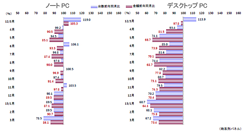 今年3月のパソコン全体の前年同月比では、台数でマイナス6.2%、金額でマイナス10.5%で、市場は縮小している。ノートPCは台数でマイナス21.5%で、デスクトップはマイナス32.8%と大幅に後退した。その背景の一つが、Windows 8製品の伸び悩み。最大の特徴であるタッチ操作でも、タッチ対応PCの販売台数構成比は16.5%にとどまり、タッチパネルの搭載はなかなか進んでいない。さらに、買替え需要の喚起が難しくなっていることや新製品の割高感などが不振の要因だとした。