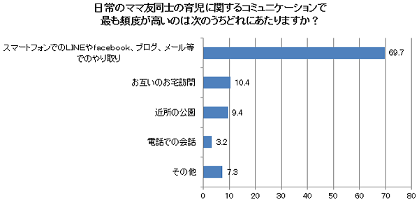 調査によると、ママ友同士のコミュニケーション手段は、「スマートフォンでのLINEやFacebook、ブログ、メールなどでのやり取り」が最も多く69.7%。「お互いのお宅訪問」は10.4%で、「近所の公園」は9.4%、「電話での会話」は3.2%で、子育てに忙しいなか、リアルで会うよりも気をつかわずに好きな時間に閲覧・投稿できるSNS(ソーシャル・ネットワーキング・サービス)は、ママにとって格好のコミュニケーションツールとなっていることがわかった。