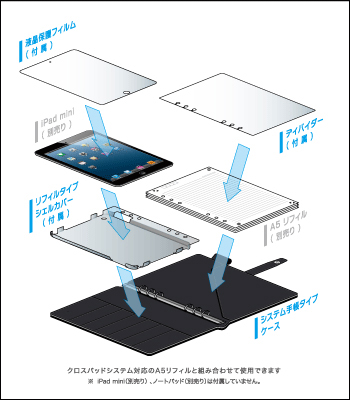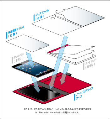アナログのシステム手帳やノートパッドなどを一緒に持ち歩けるiPad mini用ケース。システム手帳タイプの「TB-A12STRシリーズ」とノートパッドタイプの「TB-A12STNシリーズ」をラインアップする。