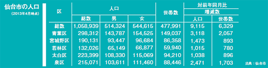 仙台市の今年4月時点の人口は105万8939人で、前年から9115人増加した。世帯数は47万7991世帯で、同じく6329世帯の増加。震災以前から東北の玄関口として人口増が続いていたが、ここ2年は2011年3月11日に発生した東日本大震災が大きな要因になっている。震災直後、津波と原発事故による被災者が県内外から流入したことに加えて、現在も復興が進まない地域からの転入が続いているのだ。泉区や青葉区、太白区などの中心部では、今、マンションの建設が相次いでいる。