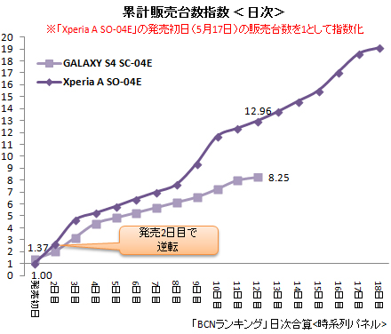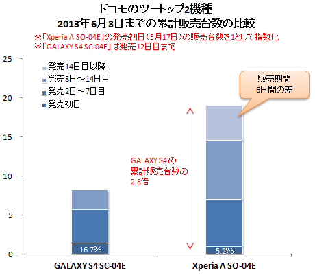 ドコモは、5月17日にソニーモバイルコミュニケーションズ製の「Xperia A SO-04E」、翌週の5月23日にサムスン電子製の「GALAXY S4 SC-04E」のBlack Mist、White Frost、5月24日にシャープ製の「AQUOS PHONE ZETA SH-06E」を発売した。このうち、「ツートップ」に位置づけられた「GALAXY S4 SC-04E」と「Xperia A SO-04E」の2機種について、発売初日の販売台数を比べると、「ドコモのスマートフォンの出足としては過去最速」と報じられた「GALAXY S4 SC-04E」のほうが多かった。しかし、6月3日までの累計販売台数を比べると、発売日が6日早い「Xperia A SO-04E」は「GALAXY S4 SC-04E」の2.3倍だ。