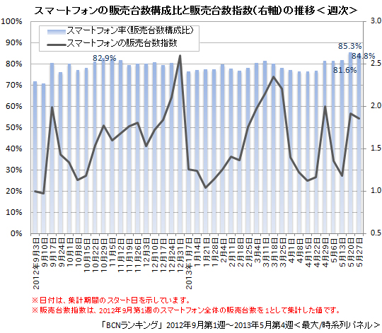 「Xperia A SO-04E」をはじめとするドコモ、auの夏モデルが売れたために、週次集計では、昨年秋以降、70%台後半~80%台前半で推移していたスマートフォンの販売台数構成比(スマートフォン率)はさらに上昇し、5月第3週は、2012年10月最終週(2012年10月29日~11月4日)を上回る、過去最高の85.3%を記録した。従来型携帯電話は、ソフトバンクモバイルの「みまもりケータイ2」、auの「mamorino3」のような防犯ブザーつきのキッズ向け端末を含めても2割を切っている。