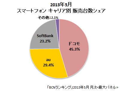 いまや携帯電話全体の販売台数の8割前後を占め、完全に主流となったスマートフォン。スマートフォンだけのキャリア別販売台数シェアは、ドコモが45.3%(前月比4.2ポイント増)、auが29.4%(2.7ポイント減)、ソフトバンクモバイルが23.2%(0.8ポイント減)。3キャリアとも、低調だった前月より販売台数は増加し、なかでもドコモは前月比約1.4倍と、かなり伸びた。夏モデルのうち、「ツートップ」に位置づけた「GALAXY S4 SC-04E」と「Xperia A SO-04E」の2機種を特別価格で提供するという新たな戦略の効果が出たようだ。