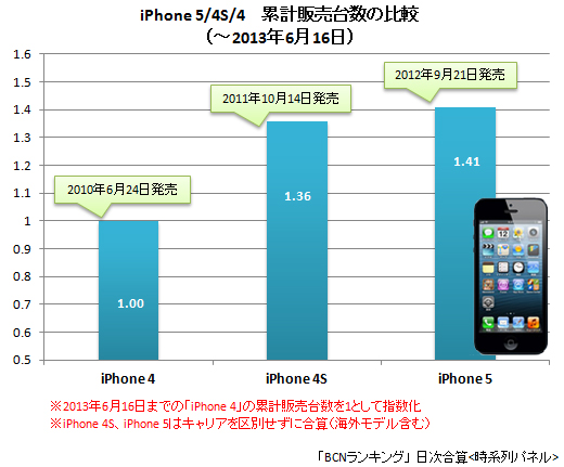 日本でのiPhone人気は底堅い。現行の「iPhone 5」は、2012年9月21日の発売から8か月ほどたった6月2日に前機種「iPhone 4S」の累計販売台数を抜き、「日本で最も多く売れたスマートフォン」となった。6月16日までの累計販売台数1位は「iPhone 5」、2位は「iPhone 4S」、3位は「iPhone 4」で、累計販売台数はモデルチェンジのたび増えている。Android搭載スマートフォンは、機種数が多いうえに全般的にモデルチェンジのスパンが短く、累計ではiPhoneシリーズに及ばない。
