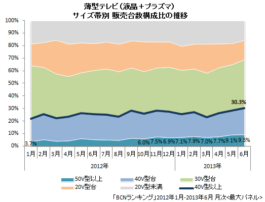 家電量販店の実売データを集計した「BCNランキング」によると、最も売れている薄型テレビのサイズは32V型。薄型テレビ(液晶+プラズマ)のサイズ帯別販売台数構成比を集計すると、2013年6月は、32V型を中心とする30V型台が38.7%、40V型台が20.9%、20V型未満が15.7%、20V型台が15.4%で、50V型台も過去最大の9.3%に達した。3年前はわずか2~3%に過ぎなかった50V型以上の構成比は、2012年2月に初めて5%を超え、2013年1月から4月までは7%台で推移していた。税別平均単価は、50V型で10万円台半ば、60V型でも20万円弱。以前よりずいぶん安くなり、引っ越しや建て替えを機に、広いリビングに見合った大画面のテレビに買い替えるケースが増えていると思われる。