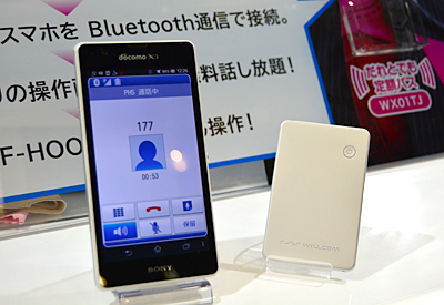 アプリ起動中は「だれとでも定額パス」のバッテリ残量、通信感度などをBluetoothで接続したスマートフォンに表示。端末価格はオープンで、基本使用料は月額490円。月額980円の「だれとでも定額」に加入すると、ウィルコム同士なら24時間通話が無料になり、他社の携帯電話、スマートフォン、固定電話への通話が一定時間無料になる。発売は7月下旬。