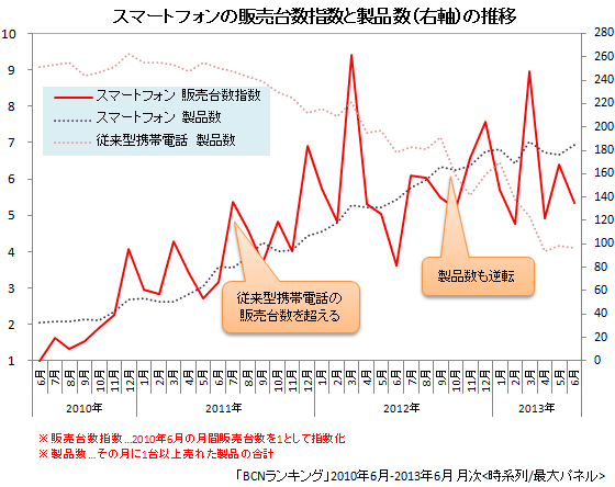 2008年7月の「iPhone 3G」発売から5年。家電量販店の実売データを集計した「BCNランキング」によると、いまや新規に販売された携帯電話の8割前後がスマートフォンになっている。今回は、2年前、2011年夏頃にスマートフォンを購入し、そろそろ買い替えを検討している方向けに、「BCNランキング」をもとに、OSや画面サイズ、カメラの画素数など、スマートフォンの主要スペックの2年間の変化をまとめた。なお、一部のデータについては、過去2年間ではなく、過去3年間のデータをもとに集計している。
