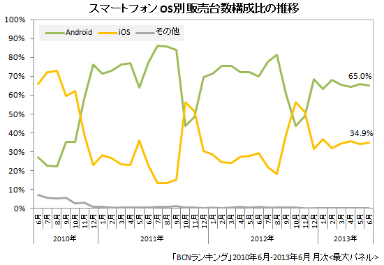 こうした機能面の差や取り扱いキャリアの制約もあり、月ごとにOS別販売台数構成比を集計すると、iPhoneの新モデルの発売直後を除き、製品数の多い「Android」が「iOS」を上回る。2011年7月から2013年6月までの累計でも、「Android」が67.9%、「iOS」は31.8%と、およそ2倍の差がついている。GoogleのAndroid、アップルのiOSに続く第3のモバイル端末向けOSとして開発され、今後、国内でも搭載機種が発売される見込みのTizen(タイゼン)やFirefox OSは、こうした状況に割って入ることになる。