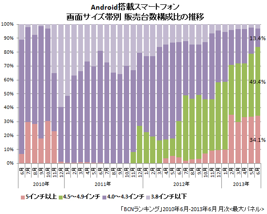 Androidに限って画面サイズ帯と解像度ごとの販売台数構成比を集計すると、最も販売台数の多い画面サイズは「4インチ台前半」から、2011年11月に初めて登場した「4インチ台後半」にシフトし、2013年2月以降は「5インチ以上」が2割以上を占めるようになった。約4.6インチのHDディスプレイを搭載した「Xperia A SO-04E」が売れた5月・6月の画面サイズ帯別販売台数構成比は、「4インチ台後半」が40%台後半、「5インチ以上」が30%台前半。以前は多数を占めていた「4インチ台前半」は10%台にとどまり、6月に至ってはわずか13.4%だった。大画面化は、内蔵バッテリの大容量化、画面の見やすさ・操作性の向上、iPhoneとの差異化など、複数の要因が重なった結果だろう。