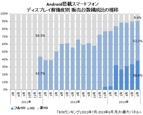 ディスプレイの大型化とともに、高精細化も進んだ。2011年冬モデルから、1280×720のハイビジョン(HD)に対応する機種が登場し、2012年3月には「HD」が半数以上を占めるようになった。2012年12月には、より高精細な1920×1080の「フルHD」対応機種が発売になり、今やAndroid搭載スマートフォンのほとんどは、「HD」または「フルHD」に対応する。