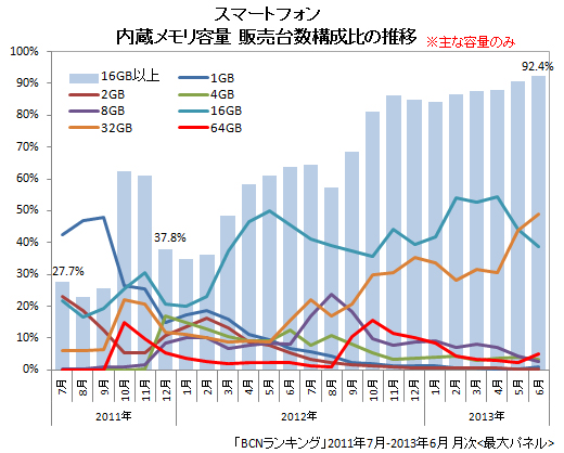 写真・動画や音楽、アプリなどを保存する内蔵メモリ(ROM)と、バッテリの大容量化も進んだ。2011年7月の時点では、最も販売台数の多いメモリ容量は「1GB」で、次に「2GB」と「16GB」が同程度の水準で続いていた。2012年12月の時点でも、最も多い容量は「16GB」、やや離れて「32GB」という状況だったが、2013年6月に初めて入れ替わった。メモリカードスロットを備え、外部メモリに対応するAndroid搭載スマートフォンは、iPhoneに比べると内蔵メモリの容量が少なかったが、2013年夏モデルから32GB・16GBが標準になり、ようやくiPhoneと同程度の水準に追いついた。現時点で最大容量の64GBは、「iPhone 5」の64GBモデルと「ARROWS」シリーズのフラッグシップモデルくらいで、まだ数は少ない。