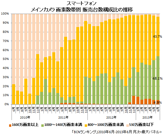 最後に、スマートフォンの主要機能の一つ、カメラの画素数の変化をみよう。メインカメラの画素数帯別販売台数構成比を集計すると、2011年7月は「800~1000万画素未満」が66.9%で最も多く、「iPhone 4」が該当する「530万画素以下」も25.2%を占めていた。しかし2013年6月は、「1000万~1400万画素未満」が48.1%、「iPhone 5」が該当する「800万~1000万画素未満」が43.7%、「1600万画素以上」が4.9%、「530万画素以下」が3.3%となり、全体的に高画素化が進んだ。必ずしも高画素=高画質というわけではないが、スペック上はコンパクトデジタルカメラと遜色がなく、撮影テクニックとセンスがあれば、フォトコンテストに出品できるようなきれいな写真が撮影できるだろう。画素数だけではなく、レンズの明るさや撮像素子の大きさなど、他の要素にこだわる動きも出てきている。