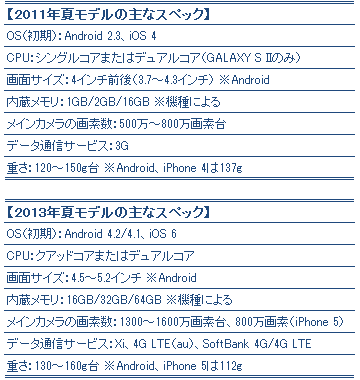 2年前の2011年夏は、ソフトバンクモバイルの1社独占販売だった「iPhone 4」や、Android搭載スマートフォンの「GALAXY S II SC-02C」「Xperia acro SO-02C」「MEDIAS WP N-06C」「INFOBAR A01」などが人気を集めていた。当時は、携帯電話全体の販売台数に占めるスマートフォンの割合がようやく5割を突破し、普及に弾みがつき始めた段階で、性能面ではまだ発展途上だった。